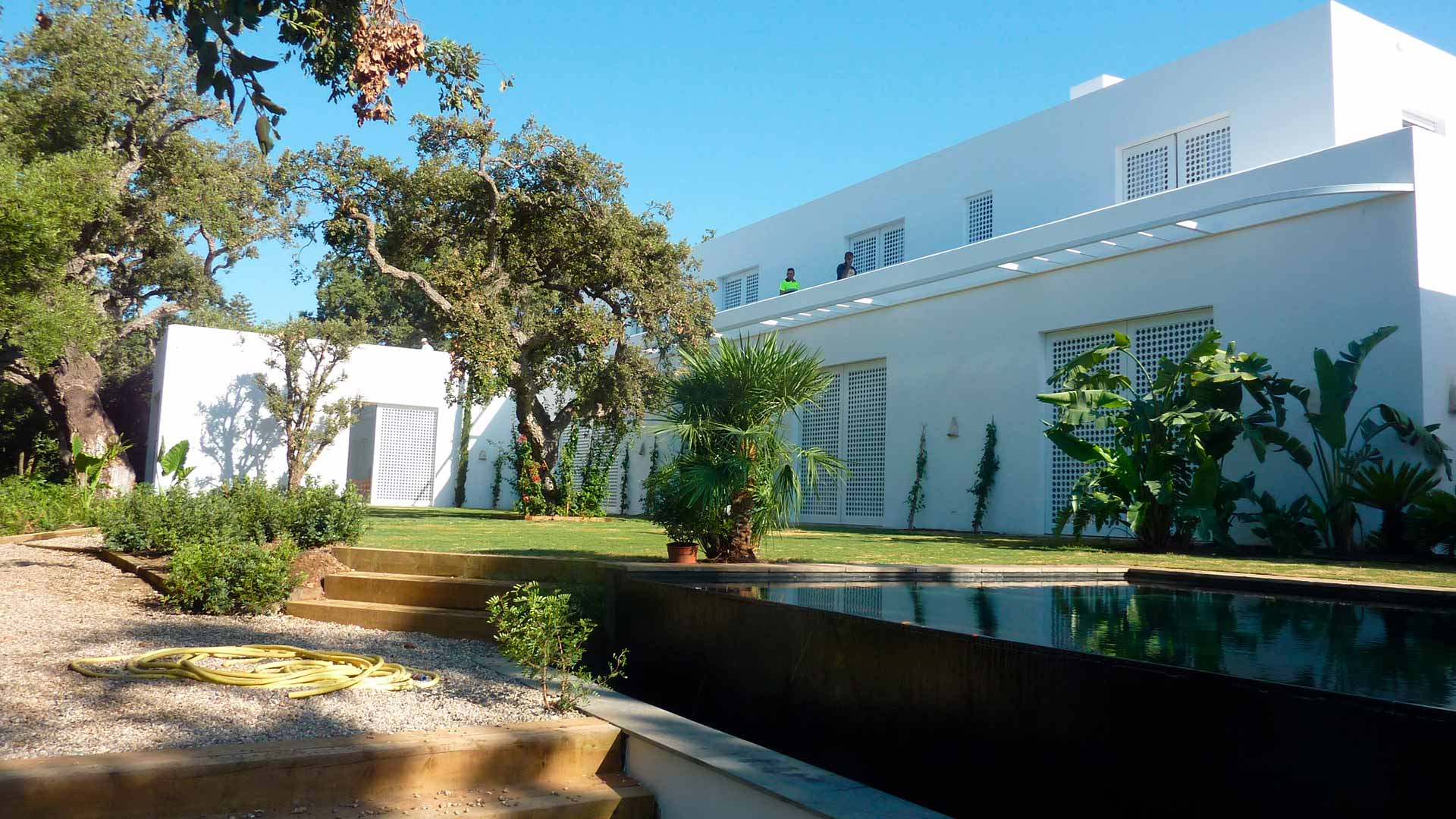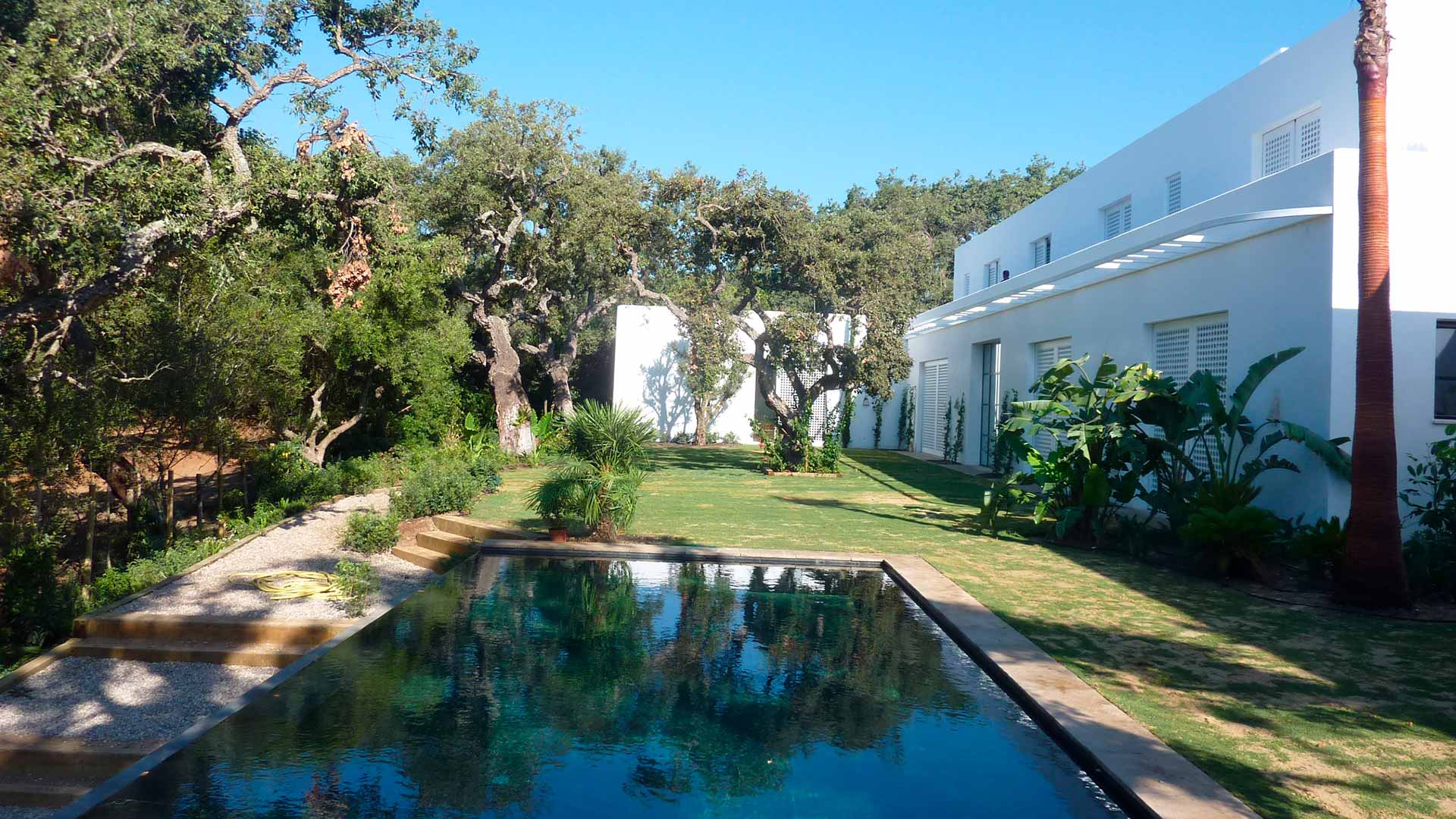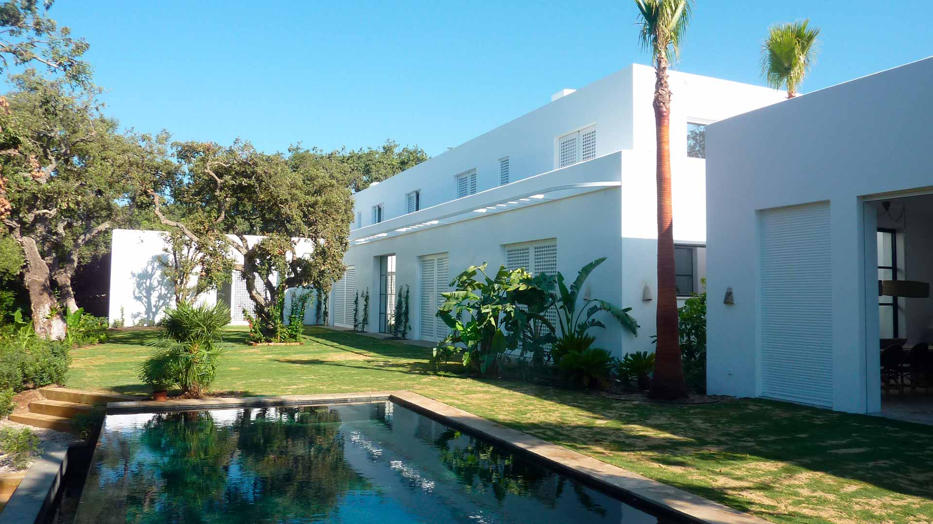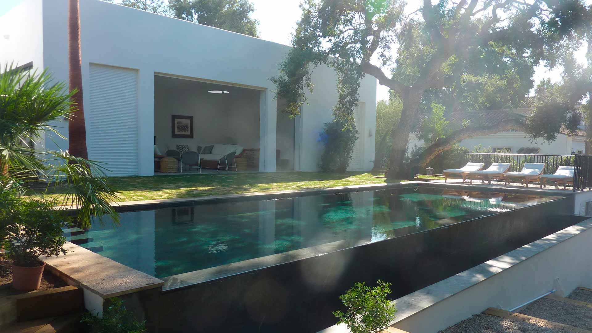 Villa perfectamente situada en el Paseo del Parque de Sotogrande, con jardín asomado al bosque de alcornoques de Guadalquitón, de cuidados detalles y materiales nobles de gran calidad.